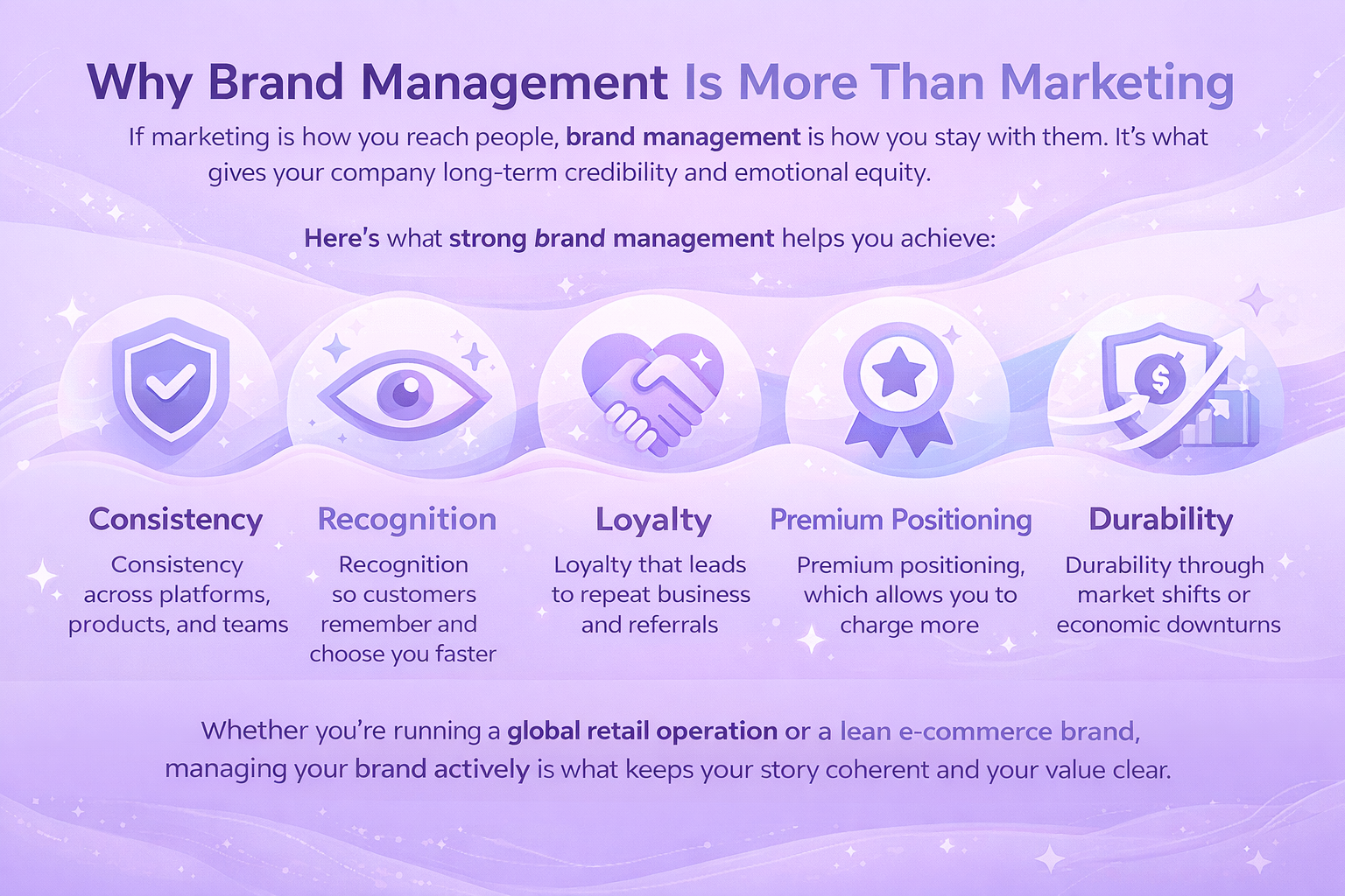 وسواء كنت تدير عملية بيع بالتجزئة عالمية أو علامة تجارية إلكترونية بسيطة، فإن إدارة علامتك التجارية بنشاط هو ما يحافظ على تماسك قصتك ووضوح قيمتك.