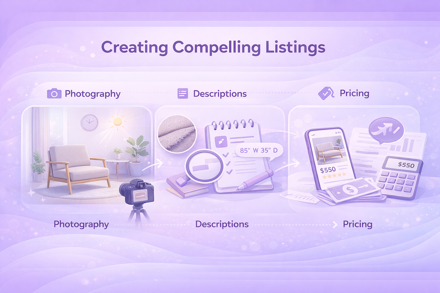 Starke Angebote übernehmen den größten Teil des Verkaufs für Sie. Möbelkäufer wollen Klarheit, Ehrlichkeit und eine visuelle Bestätigung, bevor sie sich festlegen.