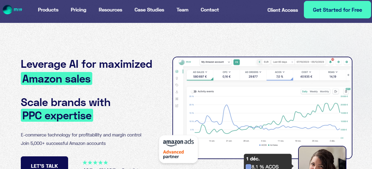 La plataforma ofrece herramientas tanto para la automatización como para un mayor control de las campañas. Puede supervisar las posiciones de las palabras clave, realizar un seguimiento de la cuota de voz y gestionar campañas DSP junto con anuncios patrocinados. También incluye análisis que ofrecen una visión completa del rendimiento conjunto de productos y anuncios. En resumen, m19 adopta un enfoque científico del PPC, combinando la automatización con el aprendizaje automático para que la gestión de campañas sea más eficaz y menos dependiente del trabajo manual.
