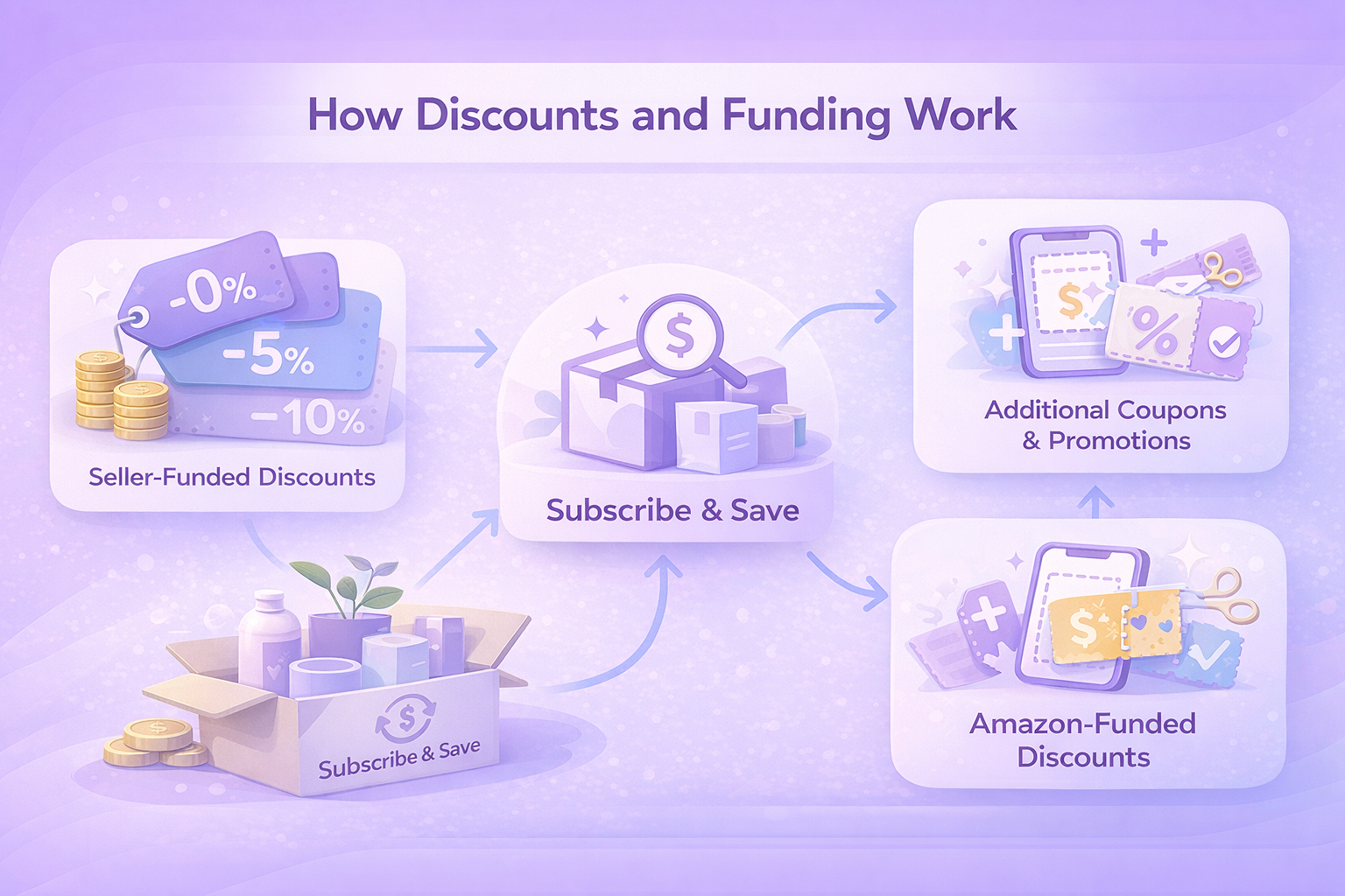 Os preços de Subscrição e Poupança são construídos em torno de uma mistura de incentivos financiados pelo vendedor e descontos apoiados pela Amazon. Compreender a forma como os dois funcionam em conjunto é fundamental para utilizar o programa sem corroer as margens.