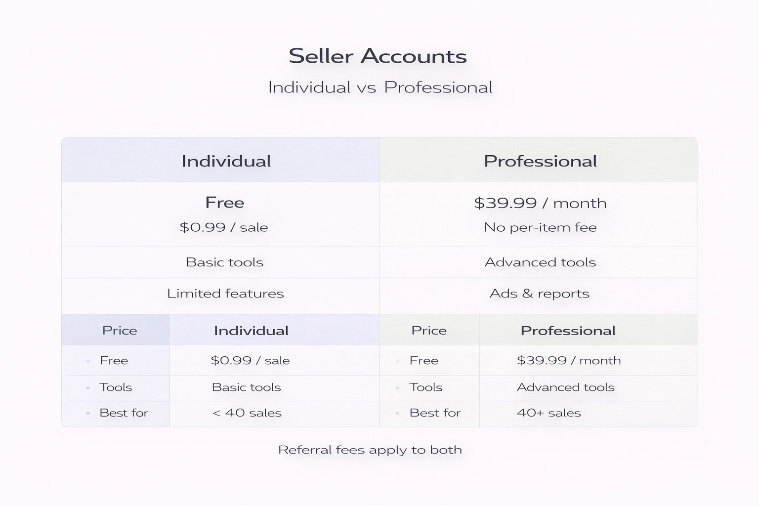 Tài khoản người bán cá nhân cung cấp gói bán hàng cơ bản và là lựa chọn lý tưởng nếu bạn bán dưới 40 sản phẩm mỗi tháng. Khi bạn bắt đầu bán thường xuyên hơn 40 sản phẩm mỗi tháng, bạn có thể chuyển từ tài khoản cá nhân sang tài khoản chuyên nghiệp. Hầu hết người bán đều bắt đầu với tài khoản cá nhân, và khi mở rộng quy mô kinh doanh, họ sẽ chuyển sang tài khoản người bán chuyên nghiệp.
