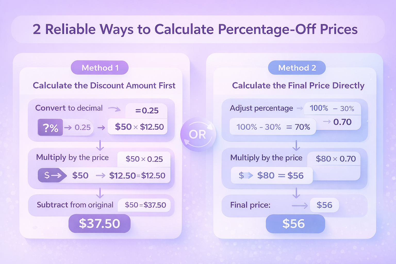 最简单的方法是用原价乘以 1 再减去以小数表示的折扣百分比。这样就直接得出了最终价格。.